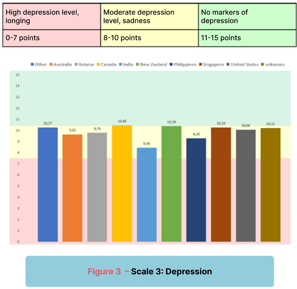 The lowest level of emotional well-being was reported by users from Belarus, meaning emotional depression and dissatisfaction with life, and a significant decrease in interest and enjoyment of life.